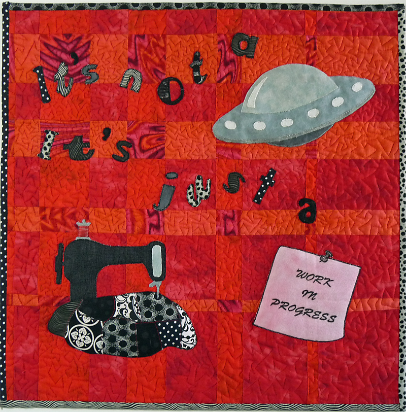 This is a comedic piece based around quilters usage of the acronym UFO. It came about as I tried to figure out a design for the more common use of “progress” and concluded it was just too big for a 15 inch square piece. I also only had a very limited time scale to work on this one.