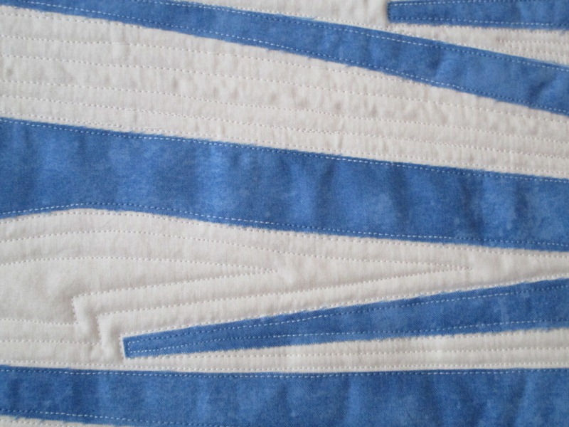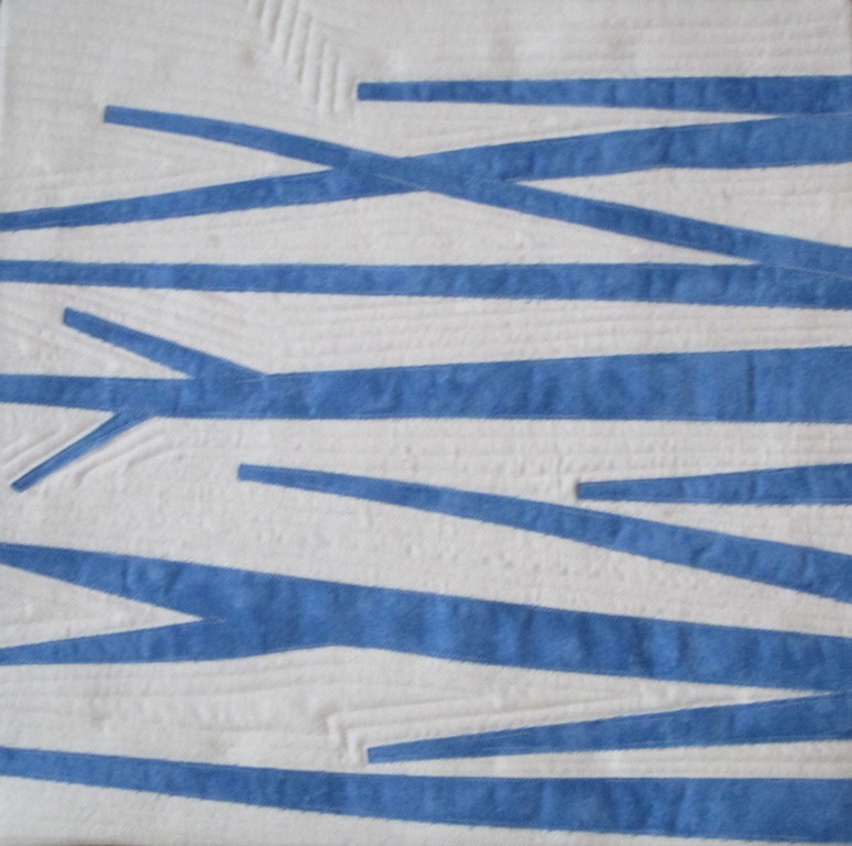 I love how the January shadows are blue against the snow across the road.  I made a sample, about which I posted on my blog.  I went on to make a second, larger piece, using blue background fabric, but that didn’t speak to the “Contrast” theme in quite the same way as pure blue and white.
