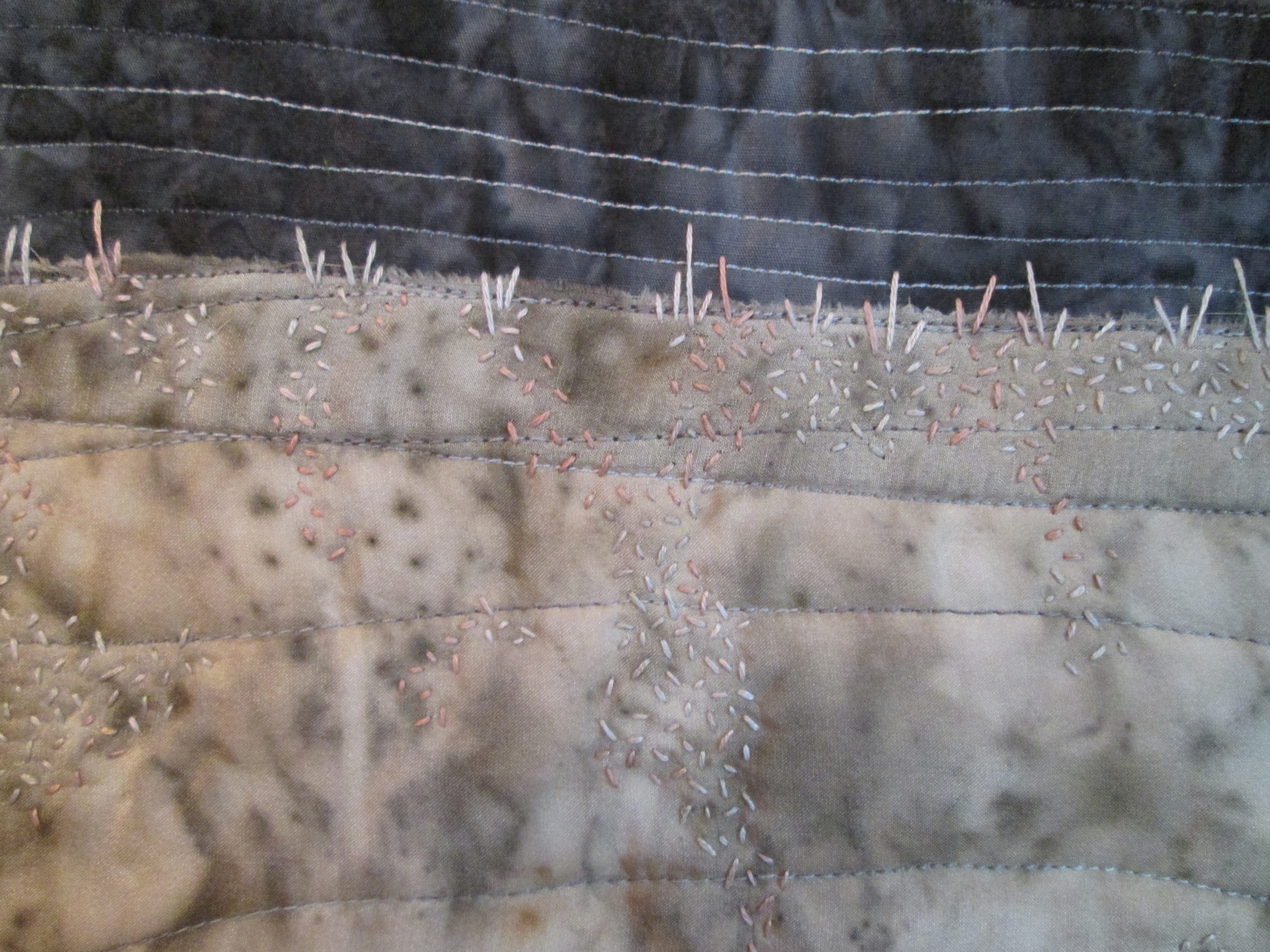 Materials: commercial cottons, hand-dyed cotton, naturally-dyed silk, recycled over-dyed sari silk ribbon, fusible web, water-soluble stabilizer (dissolved), cotton batting, cotton thread, over-dyed cotton embroidery floss, water-soluble coloured pencils.