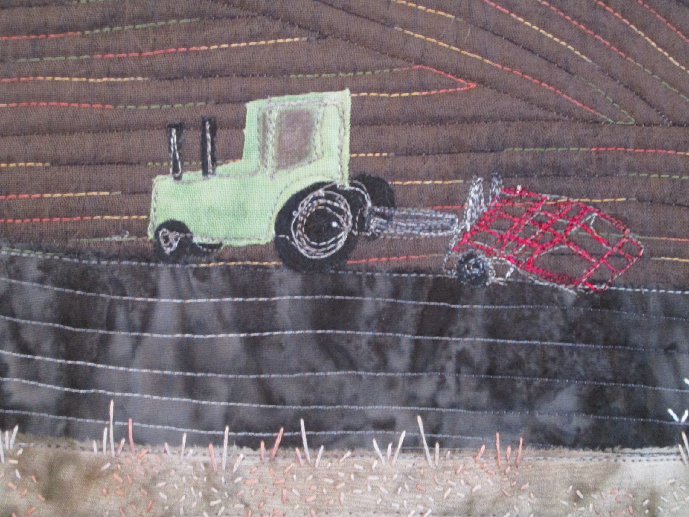 I took the above photo, which is the inspiration for my piece, in the spring of 2009. This field is at the end of a street near my home, and I’ve used it as the background for many of my pieces, particularly my miniatures. For the “Nature” theme, I wanted to express the expanse of prairie, trees and sky, so made the tractor and harrow quite small and off to one side of the slightly off-centre.