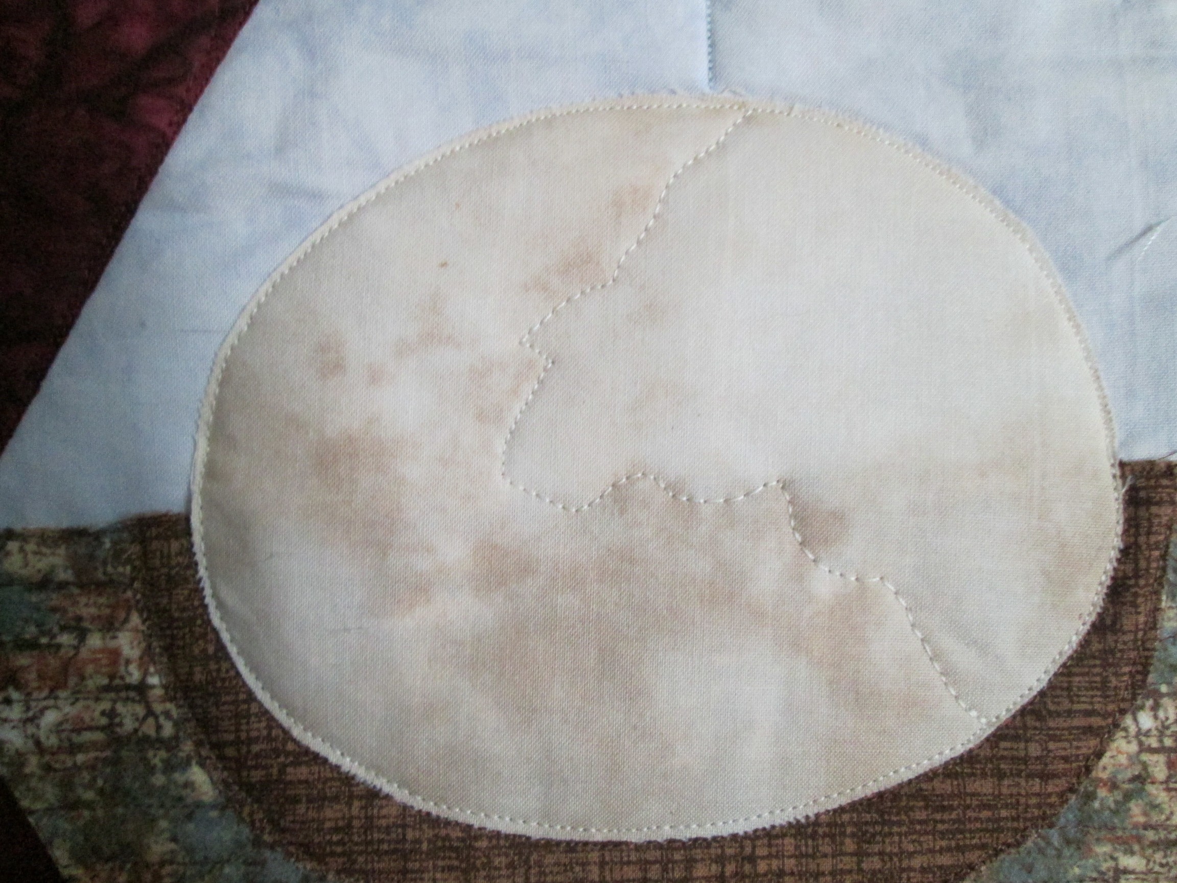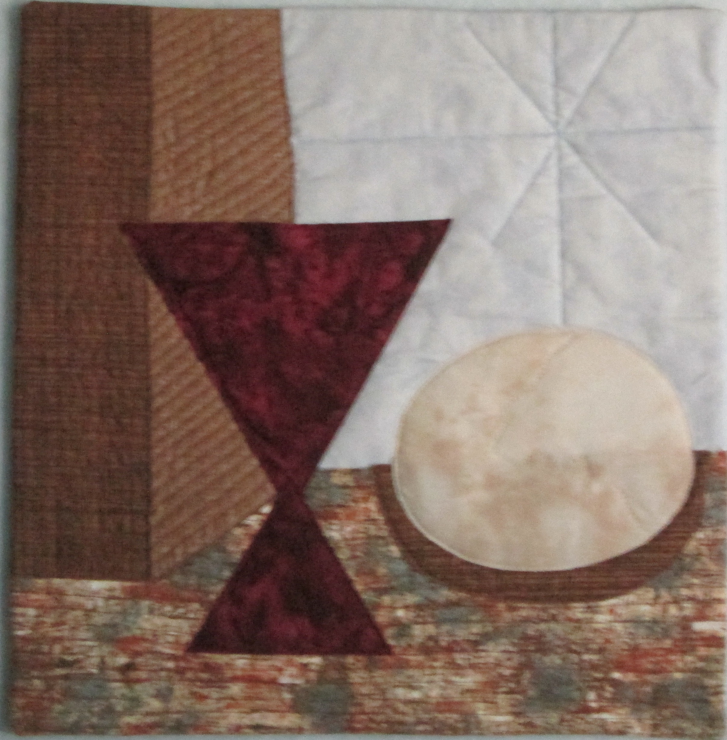 The second, “Anamnesis”, is the piece I am submitting for the challenge, even though in the end it’s a bit narrower than it should be (14.5” W x 15” L). The heart of Christian worship is the Eucharist, also known as ‘The Great Thanksgiving’ or ‘Communion’. The act of Eucharist is an ‘anamnesis’ – the Greek word for ‘remembrance’ – based on the words Jesus spoke to his disciples at what is referred to as The Last Supper. When his followers partake of bread and wine, they are to do so ‘In remembrance of me’. The layout of the piece came to me all at once, and I knew I had the perfect fabric for each part. I wanted to keep the shapes very simple, and I wanted the quilting to be clean and a bit symbolic. The wooden pillar at the left is a symbol of the cross and Jesus crucifixion. The red vessel is a cup of wine; the bread is next to it on a small plate. The vessel is quilted with the shape of a heart, top and bottom, to symbolize Jesus love for all humanity. The bread is quilted with a jagged line to symbolize brokenness – that of humanity, and that of Jesus body at this execution, ‘broken for [us]’. The patterned background on which the elements rest symbolizes Jesus’ time in the desert before his ministry, and the landscape in which he carried out much of his work. The blue background is quilted with lines symbolizing a star – the star under which Jesus was born, and a reference to Christians’ belief in him as the Light of the World. Materials: commercial cotton and cotton flannel, cotton batting, cotton thread. Techniques: fusible appliqué, machine quilting.