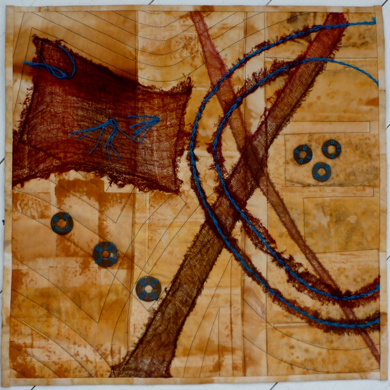 All shapes were included in these precious ‘parcels’ and I added some vinegar to a tray of water and let the fabric sit and evolve. I left it for about 2 weeks and the result was wonderful, well I think so. The washers decorating the quilt were some which had been included in the rusting process. I have always liked the contrast of turquoise with rust colour and the stitch used is chain stitch, as there was a piece of chain also included in the mix.