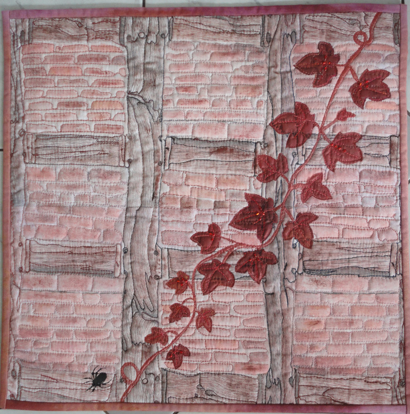 Although there was no ivy on the wall, I felt my quilt needed a little something else, so I stencilled the ivy design using markal paint sticks and then highlighted bits with fabric paints.  A few beads for good measure completed the piece.