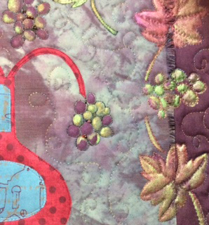 I had so many ideas, but finally settled on taking inspiration from my sketchbook, the one I almost completed after a weekend workshop with Laura Kemshall. The focus of my work was taken from a still life, which included bottles, fruit, flowers and jugs. The Mateus wine bottle shape has always been a favourite of mine and after getting that shape right, the rest just fell into place. Bonded appliqué shapes, hand drawn leaves and fruit with fabric paints to strengthen the colours and portray the lusciousness of the grapes and vine leaves. Loose, casual style machine quilting in variegated metallic thread.