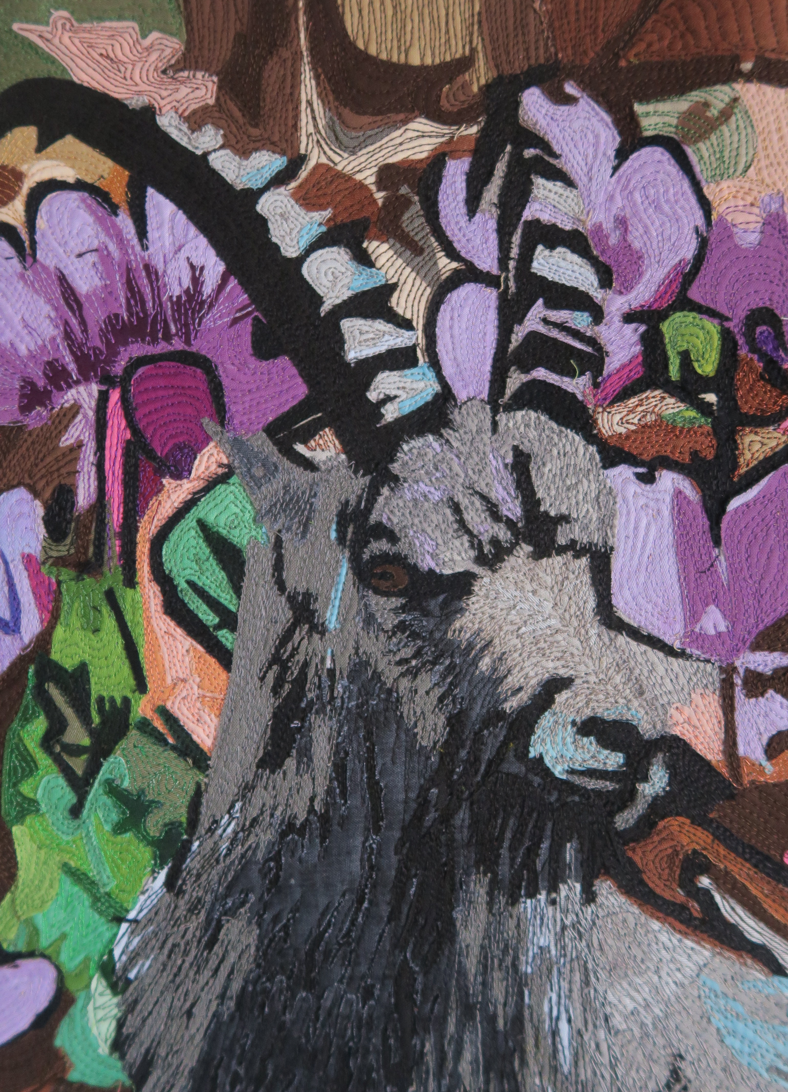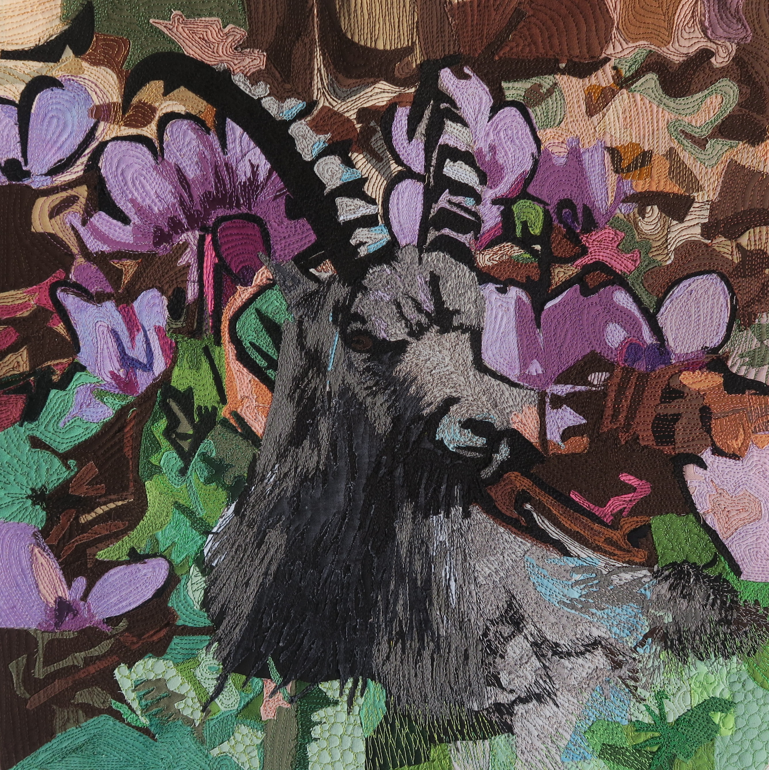 Beautiful work and great machine embroidery. I love the way you combine the flower and the goat. Bravo!