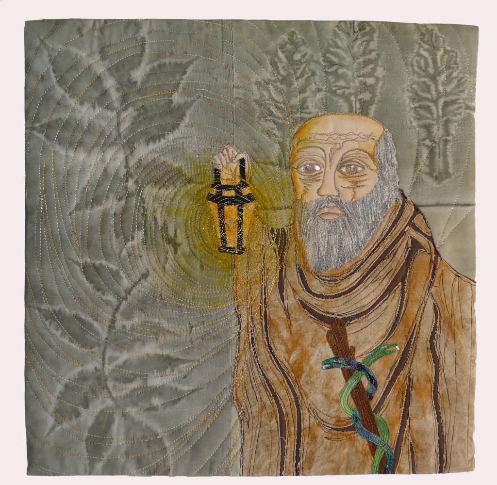 1. A very original approach to nature, great idea! The eco printed background works so well behind the hermit and light radiating from his lantern. Great piece of work.