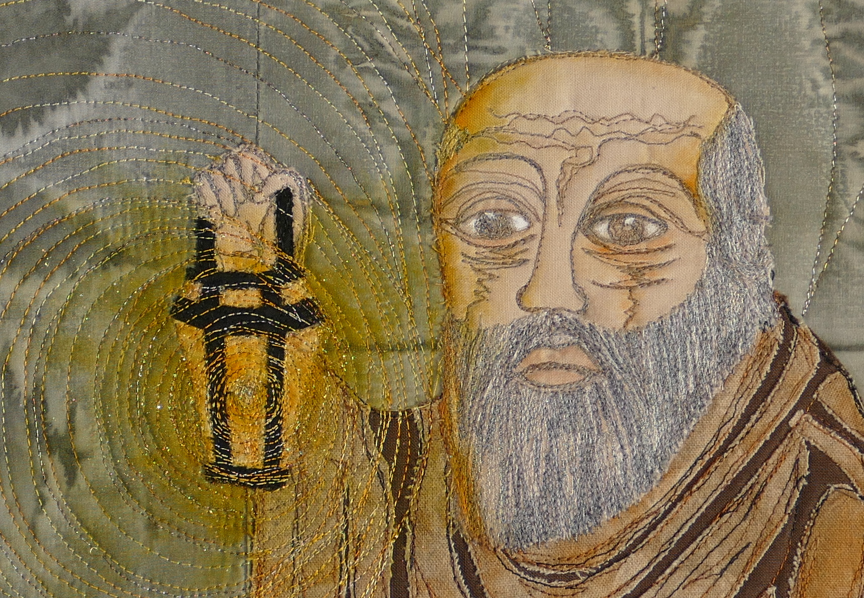 6. A very artistic interpretation of the subject. I like your printed background and it givcs just the right atmosphere for the hermit who is also beautifully stitched