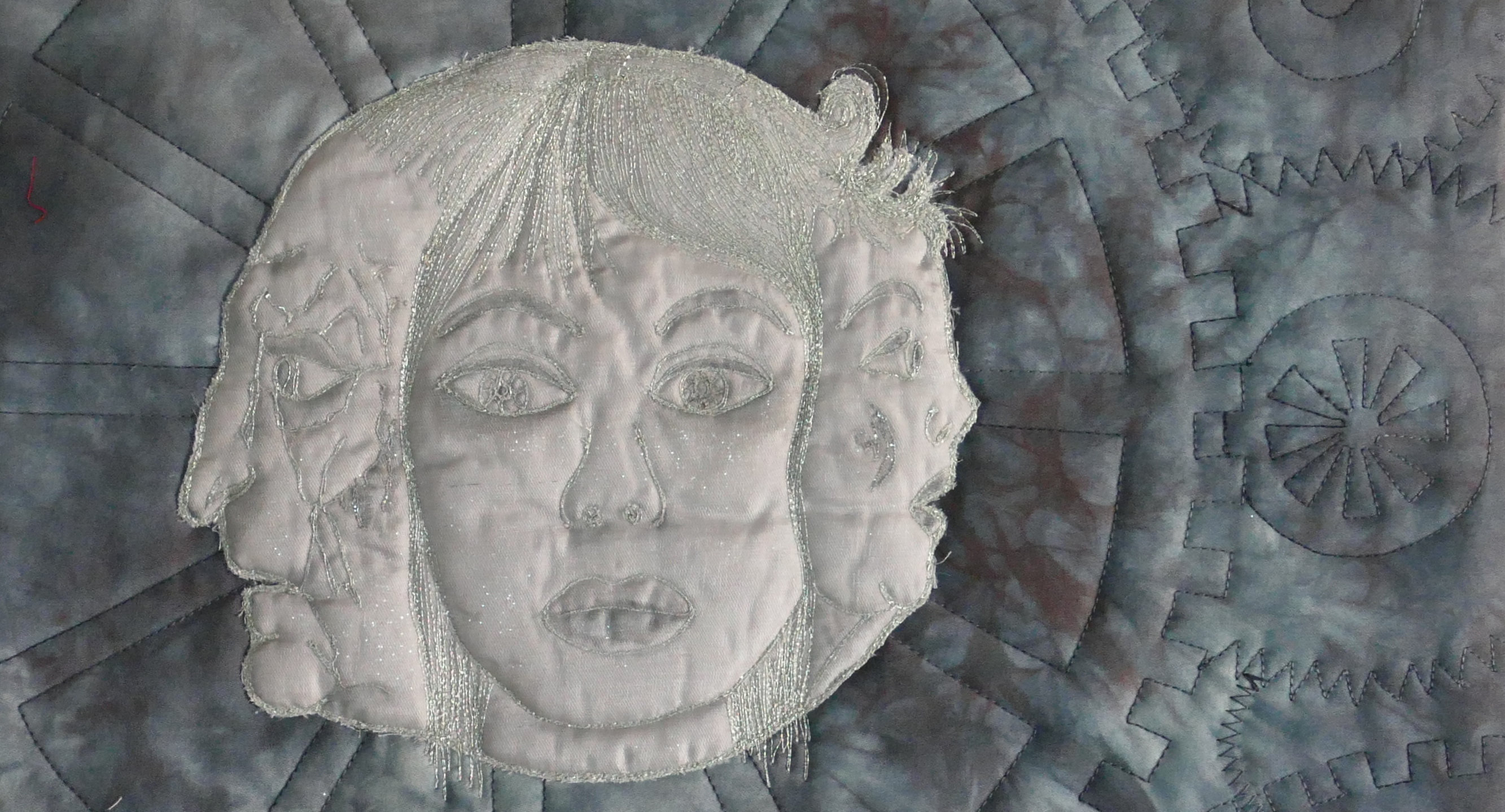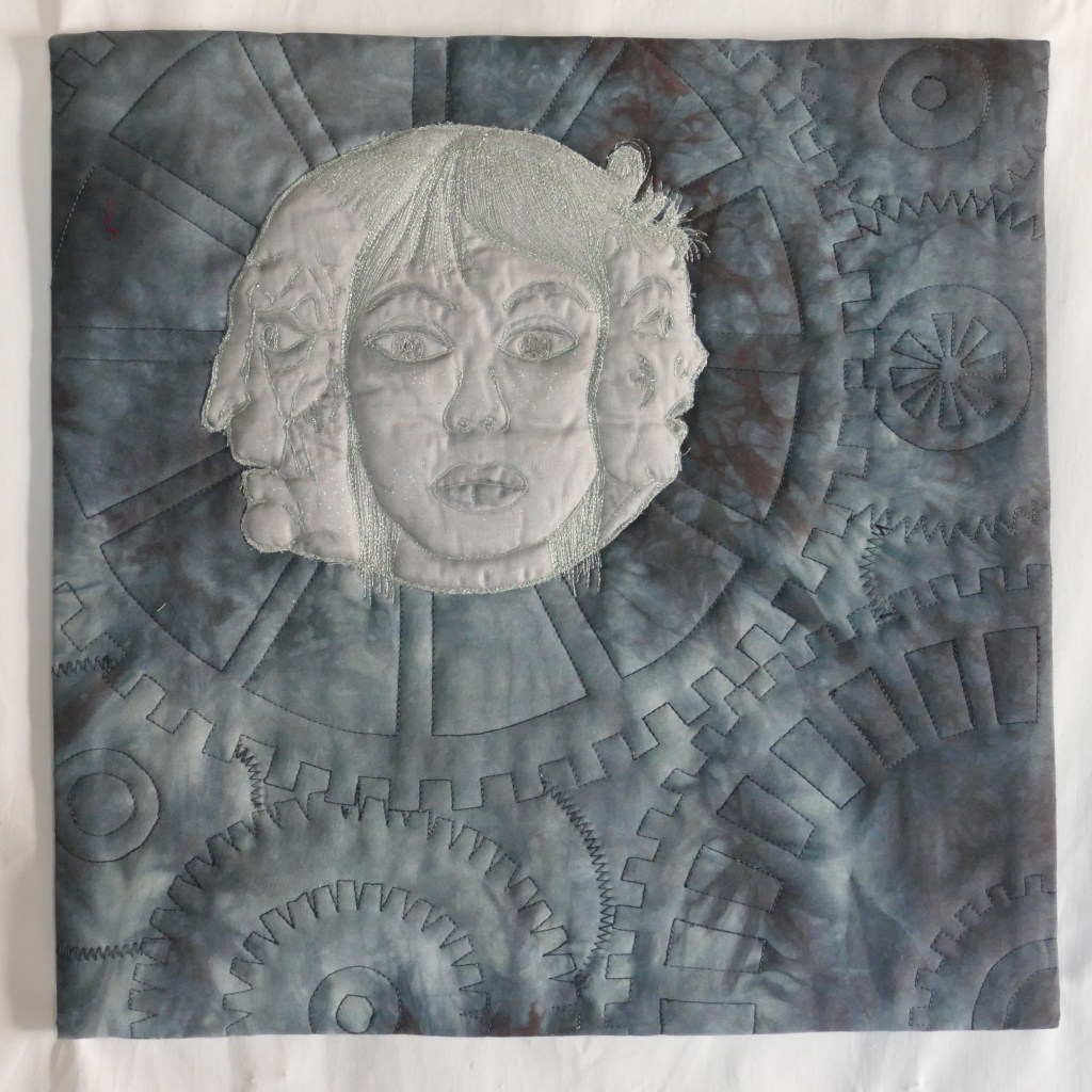 Such an interesting way to represent the passage of time in the lunar calendar with the different faces/phases of a woman. The stitching of the turning cogs is superb and the limited color palette is extremely suitable. Very special!!
