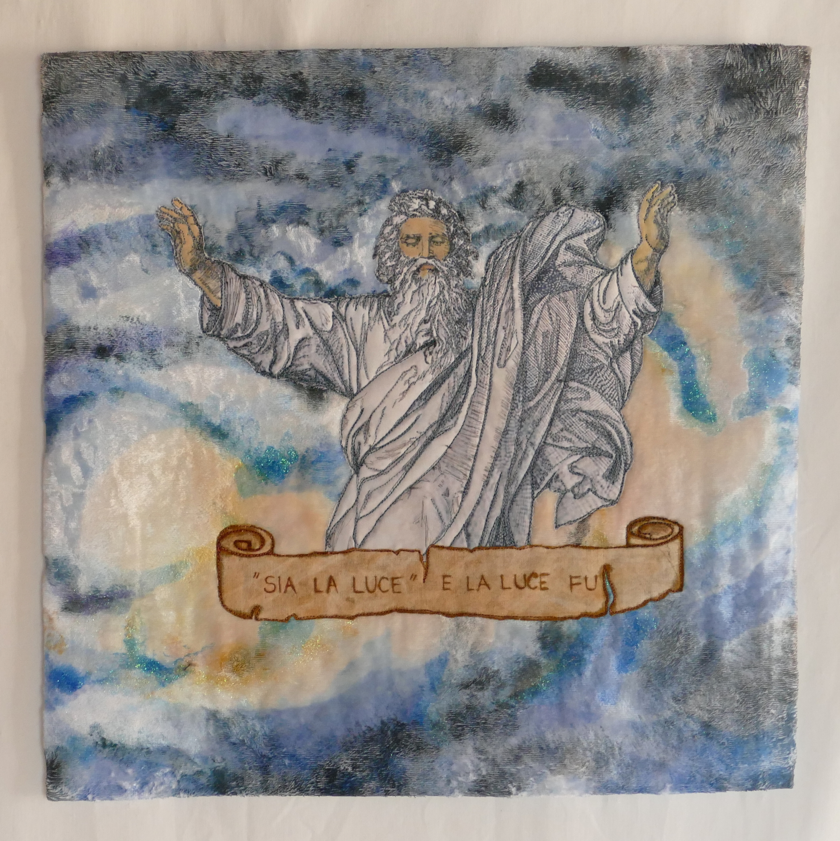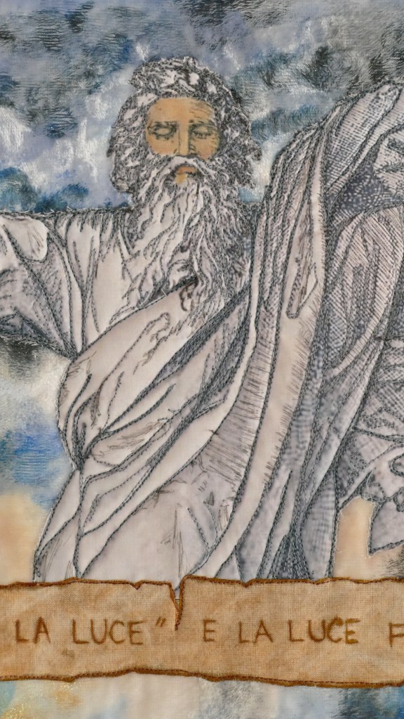 12. .What a beautiful dramatic sky and your stitching makes the figure of the Creator really stand out . Bravo