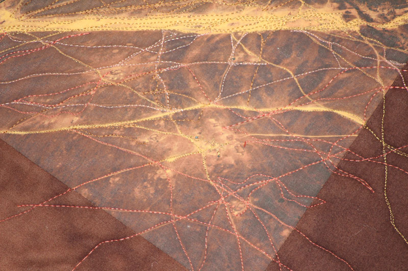 The quilt is constructed from a digital image which was much played with on the photoshop and colour punched till the trails glowed and then stitched on at the point, no other way could I get it to mix with the border fabrics ,the quilt lines helped too.