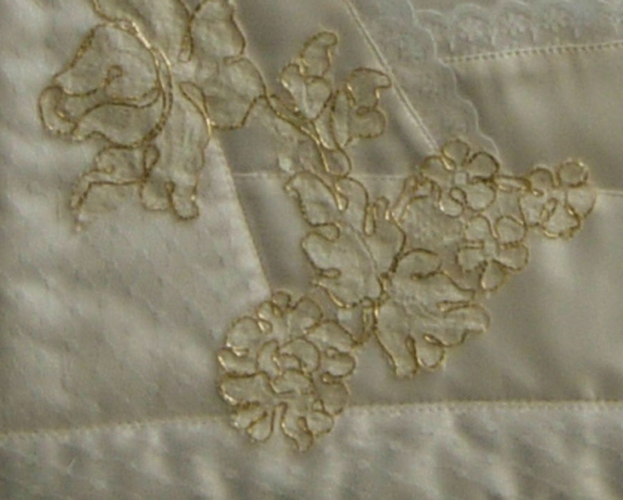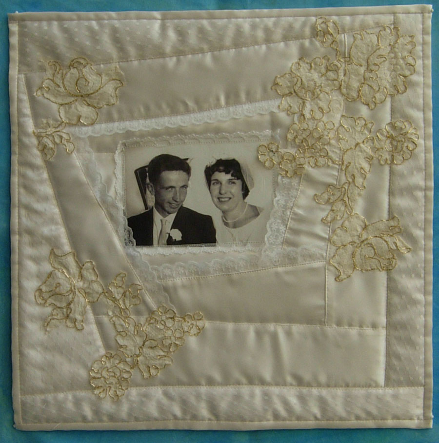 Materials: polyester satin finished fabric, net, several laces and the gold thread lace from my wedding dress bodice and back drape. The quilt construction was basic crazy quilting and the last pieces were overlaid with net. The photograph was photocopied then the photocopy was covered in fine silk and backed with a heavy Vilene. This was then carefully coated with a fine brush coat of textile binder medium, which, when dry, adhered the three layers together. This was stitched to the centre of the background and lace edged.