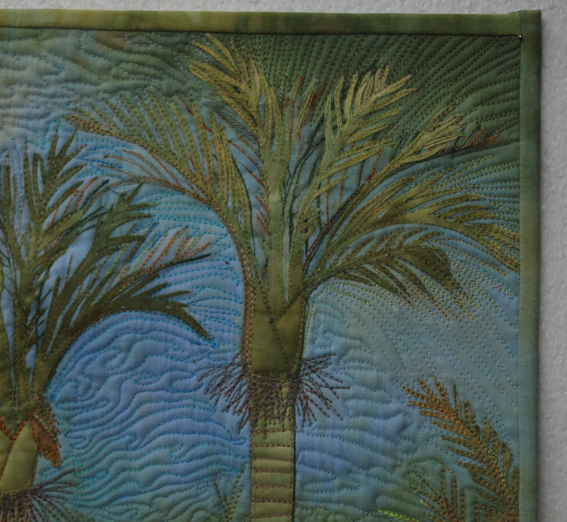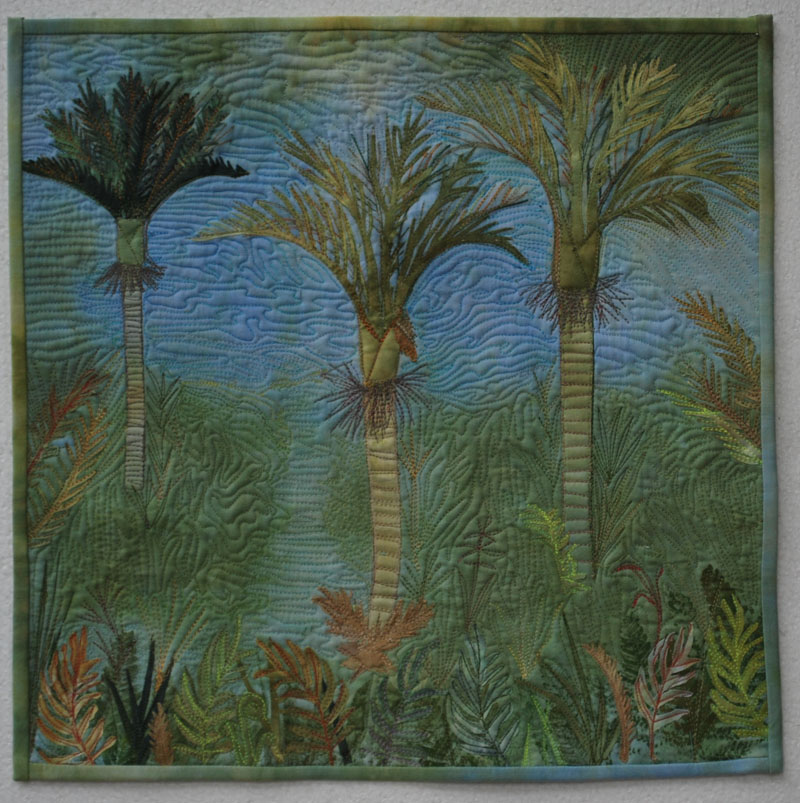 The fabric is totally my own hand dyed fabric, with the exception of the backing fabric.   I  pencilled the palms onto the background fabric, and then stitched in the fronds with different colours, before adding the fabric fronds in front with fusible web.  Some were hand painted on to white fabric, as was the trunk of the middle palm.  The other ferns and vegetation were adhered in the same manner before quilting.  I was delighted to find that I had what appeared to be a ray of light from the top of the quilt, and this was enhanced with paler thread. The tiny berries were inked on with a red fabric pen.  The berries are a preferred food of the Kereru, the native wood pigeon.