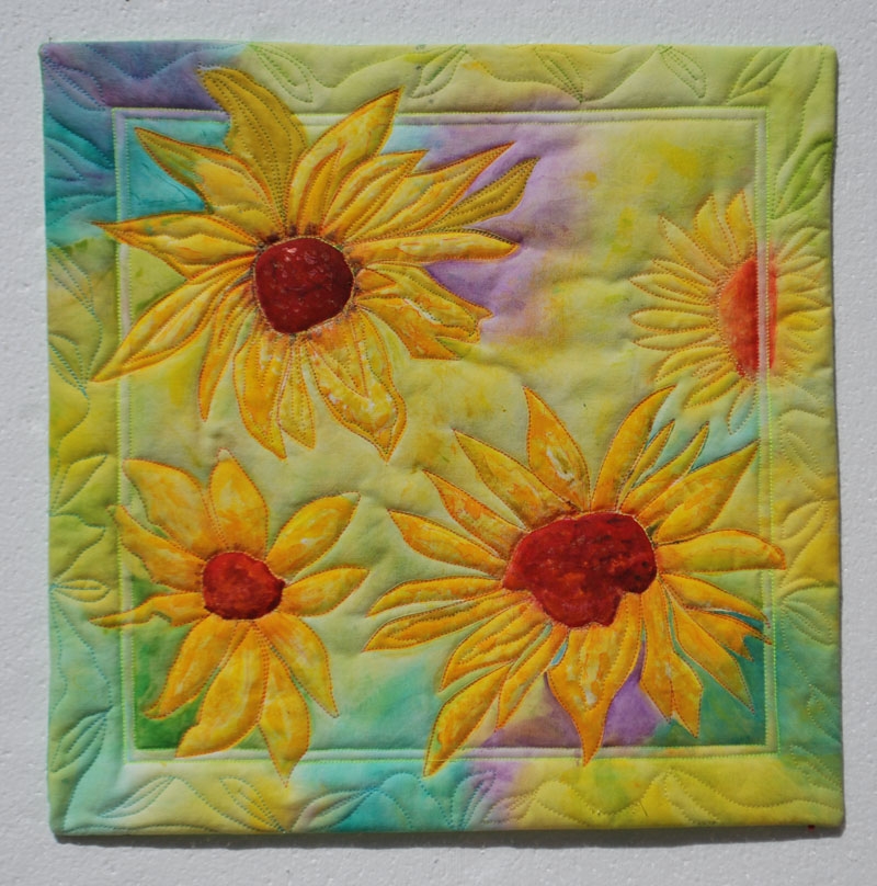 My progress with the group has very much been step my step – from a background of mainly traditional quilts and a few pictorial quilts using commercial fabrics, to adapting to designing a quilt to a theme which was initially very challenging.  I also concentrated on using fabric I had dyed, screen printed or stencilled, with a variety of techniques for embellishment. For the theme Progress, I decided to entirely paint a quilt, a new process for me, starting with a sheet of white paper for the design stage, white cotton fabric and fabric paints.  The design was transferred to the fabric with fabric pencils.  The visual effect of having an outside border was created with an adhesive quilting tape before painting.