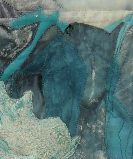 Technique: pattern developed from my drawing inspired by photographs. Fabrics used were almost 100% from my hand dyed stash, with the addition of organza. The terminal face was cut from one piece of fabric which had developed large “ice crystals” of blue on the grey background, during the dyeing process. The iceberg was made from a combination of materials (also in my Geode quilt) – crumpled tissue paper, which was adherred to pellon with a firm fusible web, then painted. The final coating was a light spray of Moon Shadow Mist with a turquoise glow.