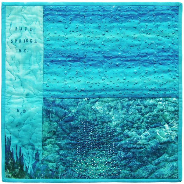 I visited these springs many years ago when there was an underground viewing area and it was amazing seeing the water bubbling up and this is what I have portrayed in the bottom section of the quilt, along with the reeds in the left hand section. The panel on the left is one of my hand dyed fabrics, painted and stamped with fabric paint. The top panel on the right is machine quilted in a bubble pattern and the remainder of the quilt is hand quilted.