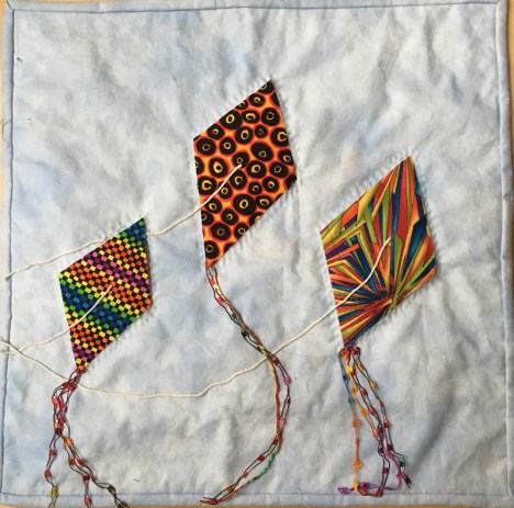 9. Love the way you put your kites in the quilt. Strong colours and nice tails and threads. Let the wind catch them….