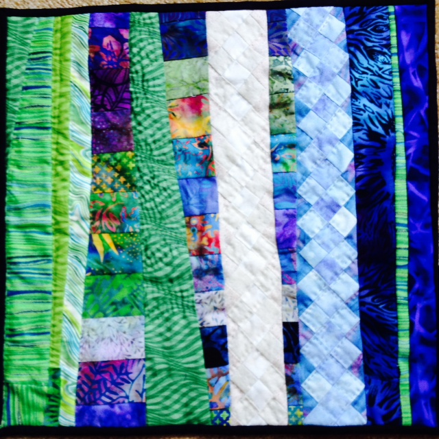 The combinations of horizontal and vertical lines…and the injection of those pieced squares on the right…an interesting use of texture breaking through the “natural” colours of blues and greens. You’ve pared the wide theme down to its elements.