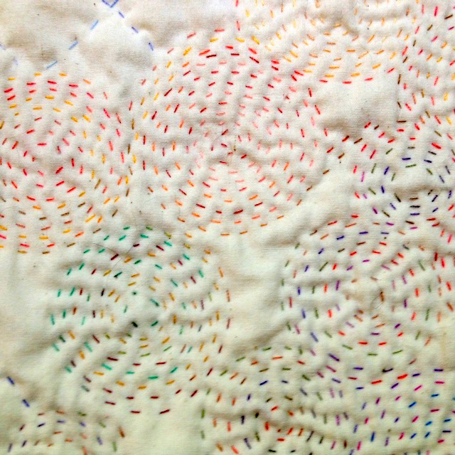I love the use of color in the hand quilting. It is beautiful. The white background with the subtle hints of color from the threads is terrific.