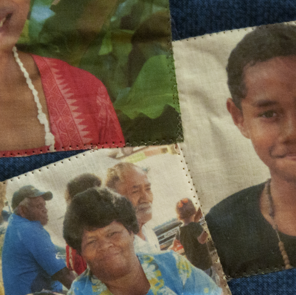 Made from commercial cotton fabrics, photographs transferred onto cotton lawn, cotton batting and threads. The techniques used are raw edge machine applique and machine quilting.