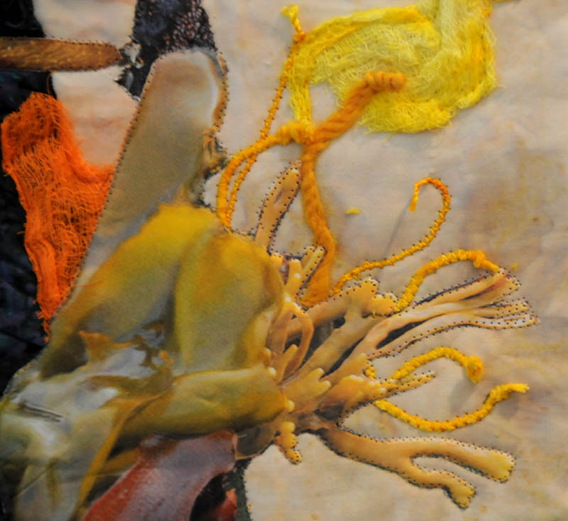 California Tidepool is my interpretation of elements of several of these photographs arranged to create a “fantasy” California tide pool. This pool includes bull kelp, a hardy seaweed which can grow up to ten inches a day, kombu, another type of kelp, and a sea anemone like creature. The piece incorporates a number of techniques including fabric “created” with Texture Magic™,turned edge and raw edge machine appliqué, photo transfer, machine quilting, and couching. Incorporating all of these elements into a 15” quilt, and working with the thick textured fabric posed a number of technical challenges.