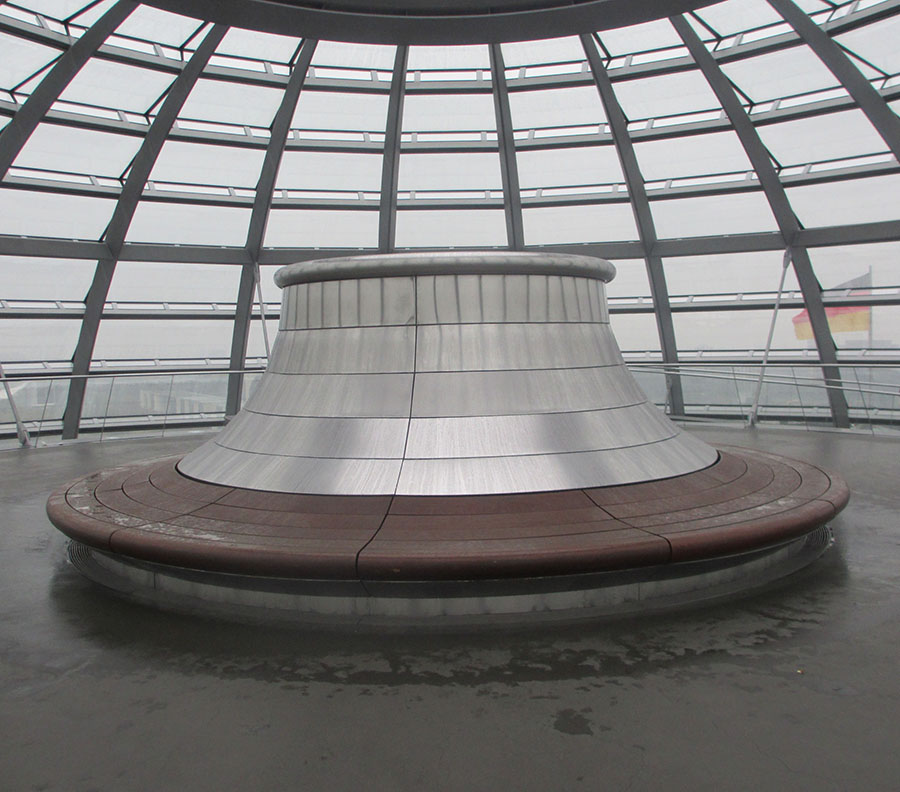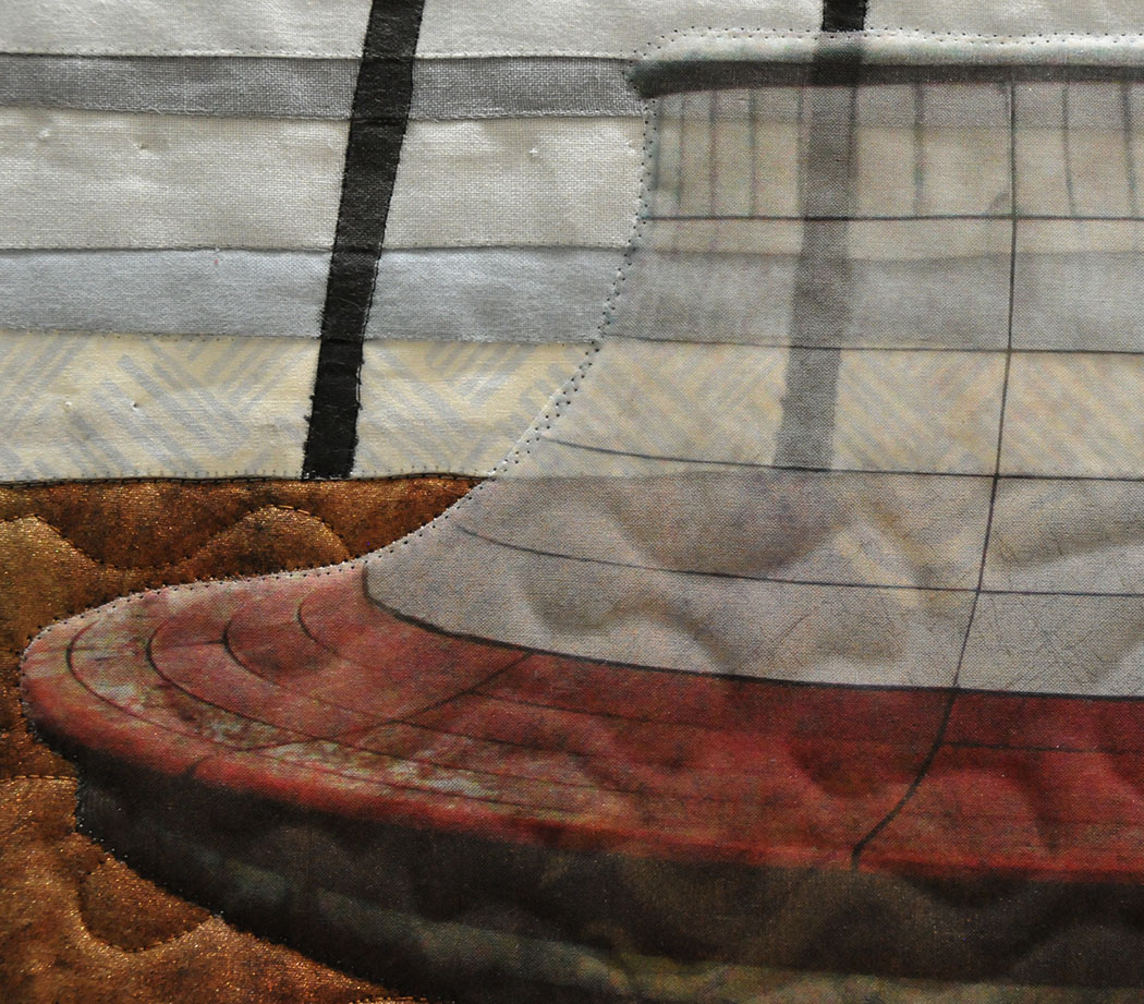 I visited the Reichstag in October 2015, on a grey, windy, rainy day. The rain came into the dome, creating a glistening floor. The photograph which we took illustrates the graphic nature of the dome. The windows were replicated using Caryl Bryer Fallert Gentry’s applipiecing technique. The vertical steel beams were stenciled onto the background using Tsukineko ink. The central element which enables visitors to see the plenary chamber was isolated and printed onto silk organza.