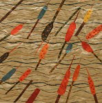 The sky was hand painted using Pebeo Setacolor transparent paints, and then helioprinted with cattail and tree trunk shapes which were later outlined in heavy thread. The cattail bodies were made from polyester batting saturated with Jacquard Dynaflow paints. The ground, lake and stems were created from commercial cotton batiks, and the spikes were created with couching.