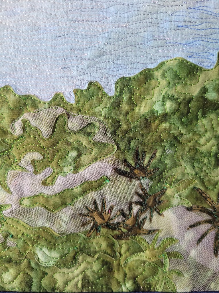 Materials: hand-dyed and commercial cotton fabrics, tulle for the mist, metallic machine embroidery thread.