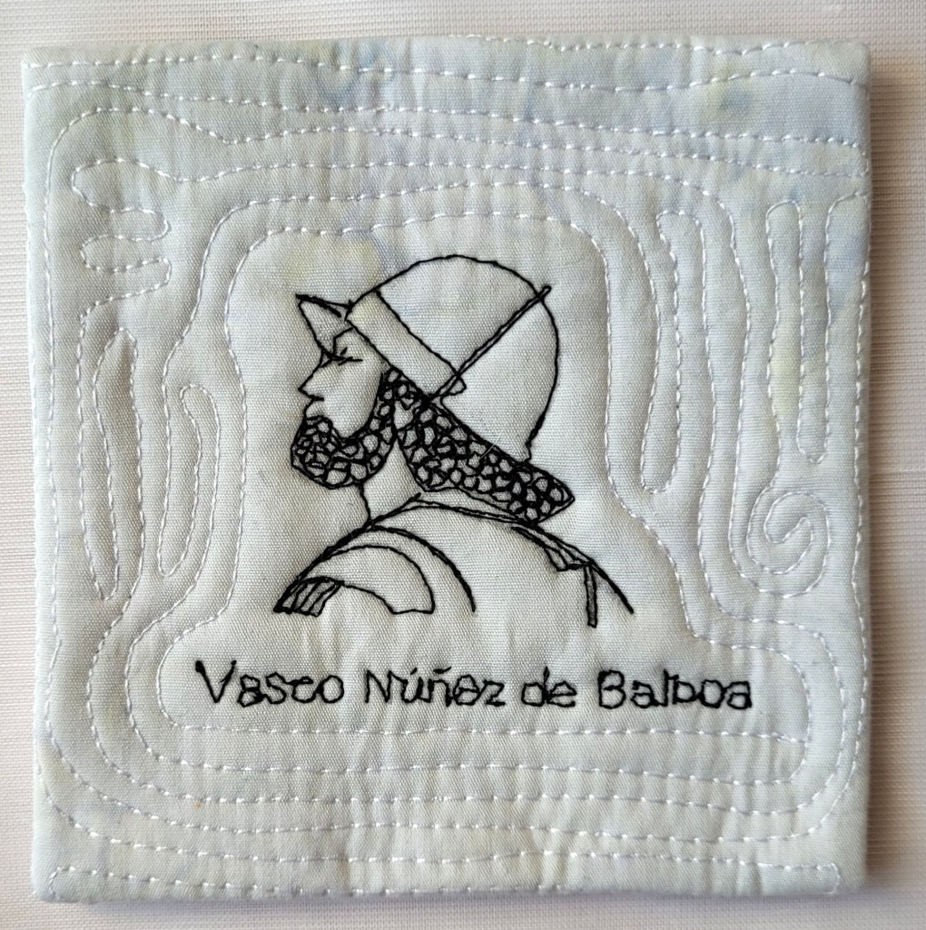My quilt shows how I imagine that first view of the Mar del Sur, seen by Balboa after climbing a rock surrounded by harsh rainforest. I also added a small portrait of Balboa himself, even though no verified portraits of him exist.