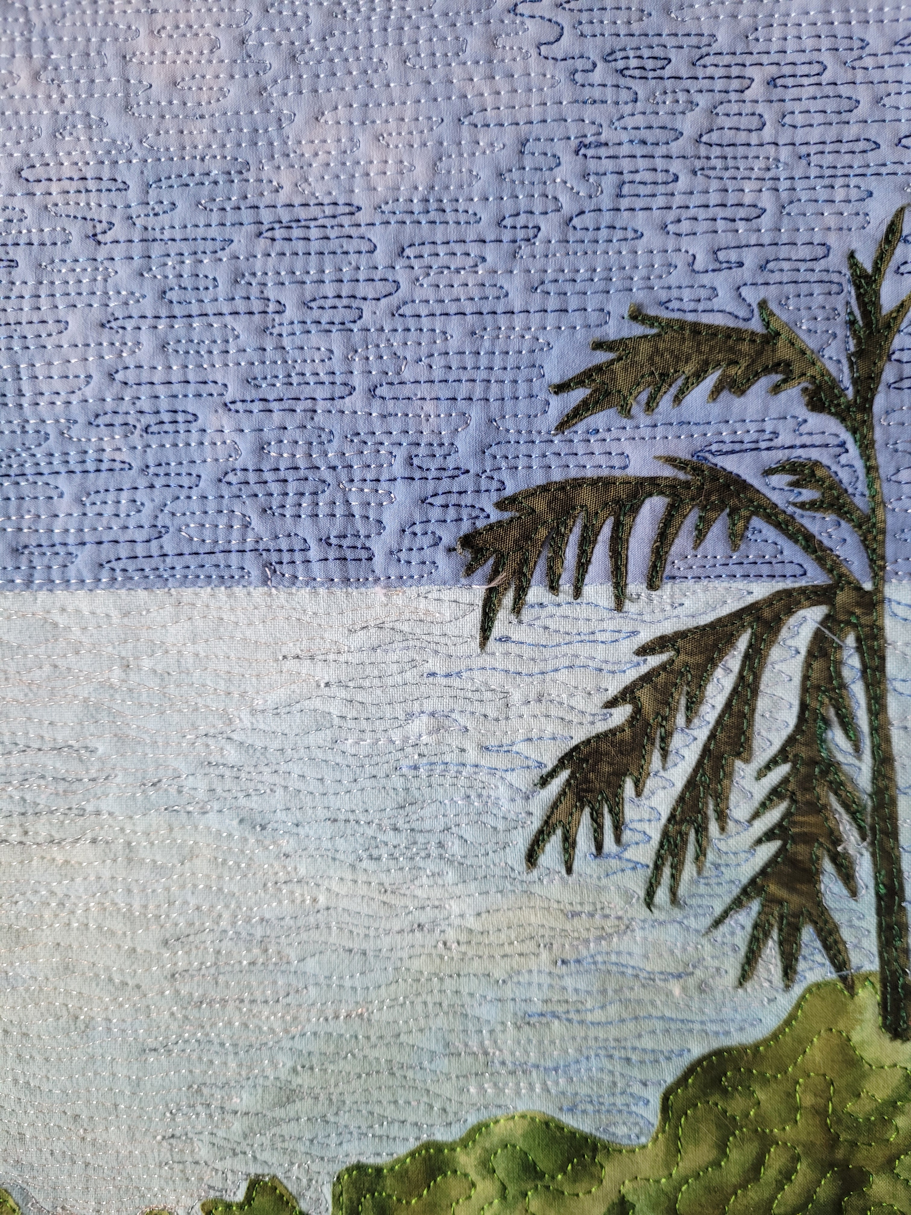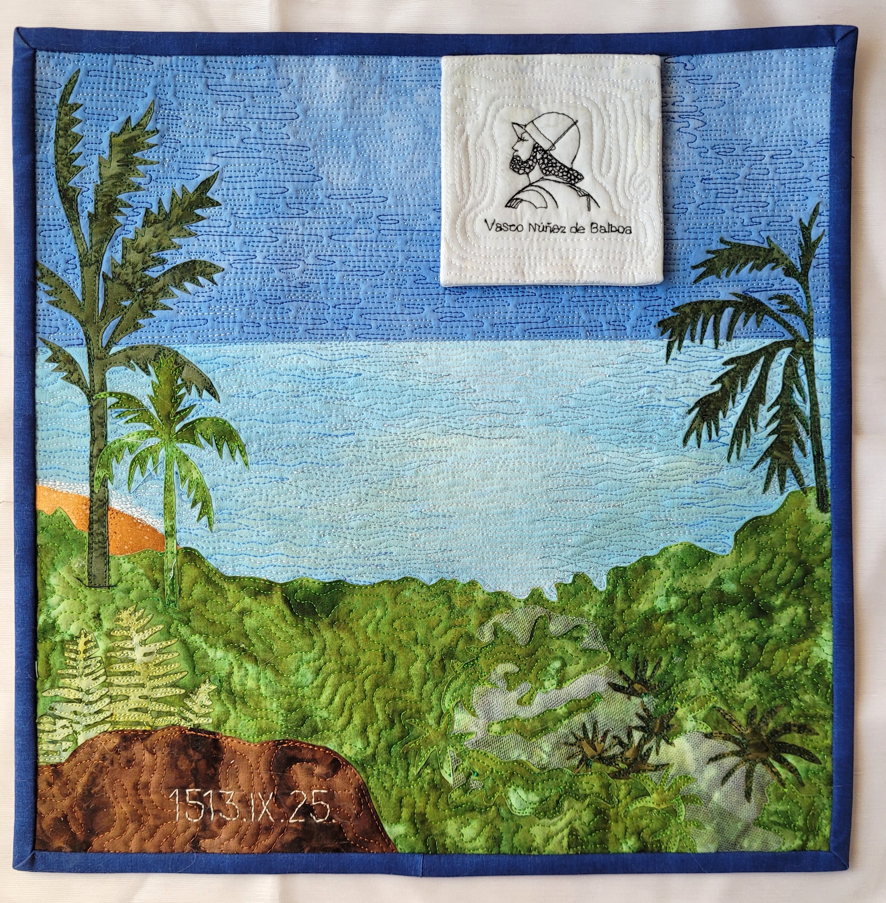 My quilt shows how I imagine that first view of the Mar del Sur, seen by Balboa after climbing a rock surrounded by harsh rainforest. I also added a small portrait of Balboa himself, even though no verified portraits of him exist.