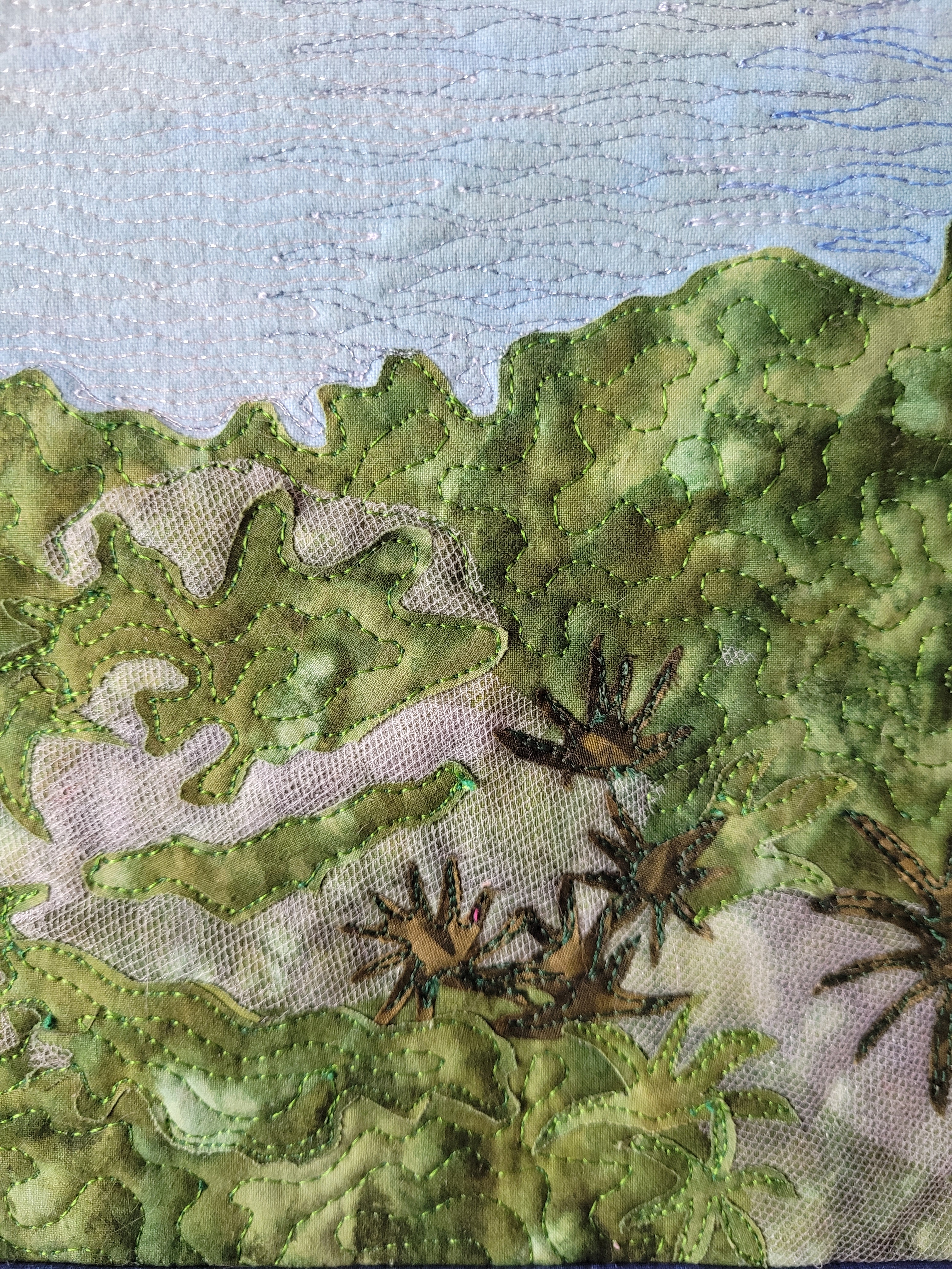 Materials: hand-dyed and commercial cotton fabrics, tulle for the mist, metallic machine embroidery thread.